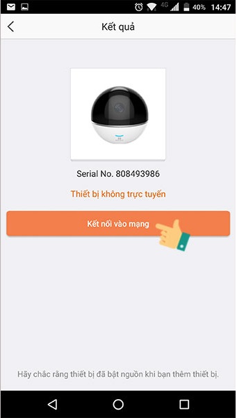 Ứng dụng EZVIZ sẽ tiến hành kết nối với camera EZVIZ của quý khách và khi kết nối thành công sẽ có thông báo như hình dưới. Bước tiếp theo quý khách chọn “Kết nối vào mạng” để thiết lập kết nối mạng cho camera.