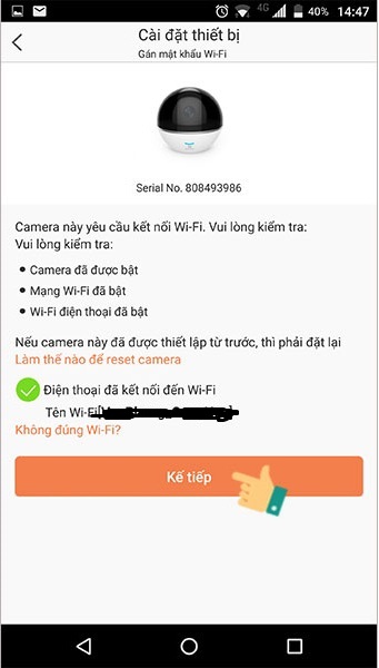 Thông tin cấu hình mạng không dây Wifi của camera wifi hiện ra, hãy đảm bảo rằng tên Wifi mà camera nhận được với Wifi mà quý khách đang kết nối trùng nhau, sau đó chọn vào Kế tiếp rồi nhập mật khẩu Wifi.