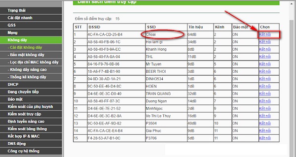 Bước 3: Ngay sau khi bấm chuột vào nút Khảo sát, nó sẽ hiện lên một bảng danh sách mạng wifi. Hãy bấm chuột vào nút Kết nối (Chú ý: Chọn đúng mạng wifi muốn kết nối)