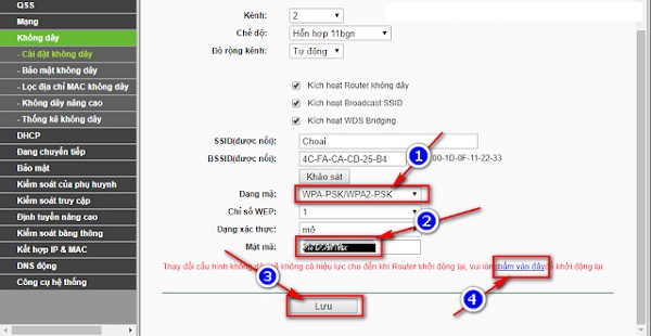 (1) Bấm chuột chọn WPA-PSK/ WPA2-PSK trong ô Dạng mã.