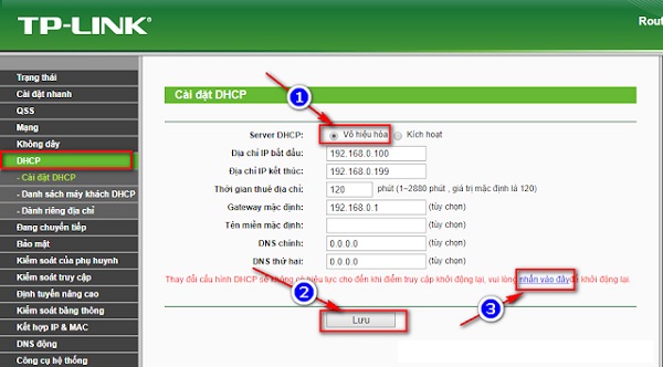 - (3) Bấm chuột vào chữ nhấn vào đây để TP Link khởi động lại.
